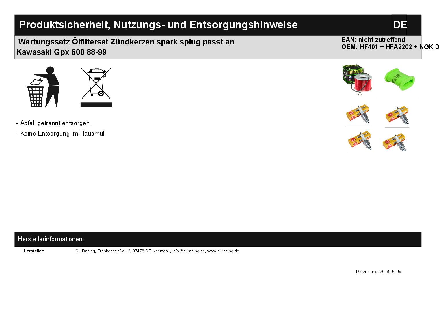 In dieser Auktion gibt es folgenden Artikel zu kaufen: Wartungskit (ähnlich Foto) Modell: passend für Kawasaki GPX 600 R Bj.: 88 - 90, 93 - 99 Lieferumfang: 1 x Ölfilter Hiflo HF401 1 x Luftfilter Hiflo HFA2202 4 x Zündkerze NGK DR9EA Artikelzustand: neu Es handelt sich hierbei um kein Originalteil! Bei Unklarheiten oder Fragen bitte erst E-Mail schreiben.