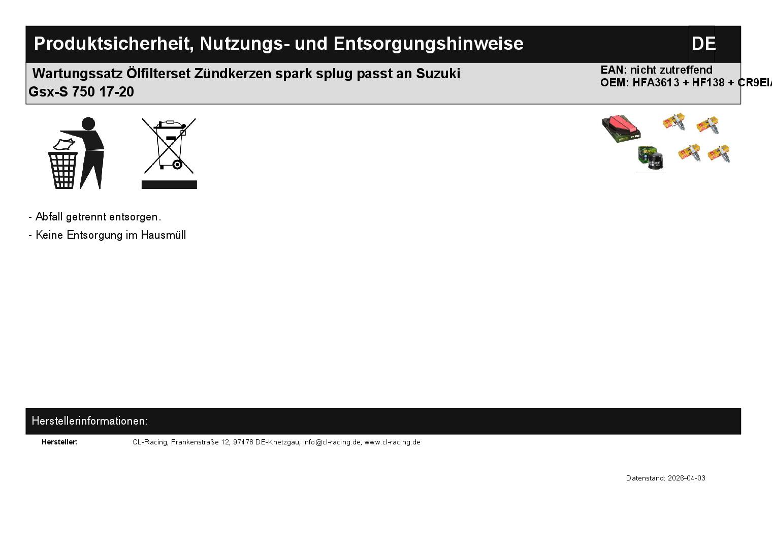In dieser Auktion gibt es folgenden Artikel zu kaufen: Wartungskit (ähnlich Foto) Modell: passend für Suzuki GSX-S 750 A ABS Bj.: 2017 - 2020 GSX-S 750 AZ ABS Bj.: 2017 - 2020 GSX-S 750 UQY ABS Bj.: 2019 - 2020 GSX-S 750 WQZ ABS Bj.: 2020 Lieferumfang: 1 x Ölfilter Hiflo HF138 1 x Luftfilter Hiflo HFA3613 4 x Zündkerze NGK CR9EIA-9 Artikelzustand: neu Es handelt sich hierbei um kein Originalteil! Bei Unklarheiten oder Fragen bitte erst E-Mail schreiben.